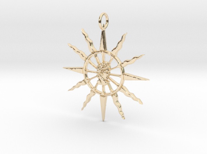 The pendant is made of a twelve spokes chariot wheel inside a twelve spikes sun. Apollo's has the symbol of the chariot of the sun, and the chariot is the early technological means of Indo-European dominance. 12 spokes & spikes because it is a sacred number in indo-european religions, for instance it's the number of Olympian gods. Eight of them are wavy rays to make it clear it is our sun because other stars are commonly symbolized with straight rays. And four of them are straight rays in the common "four directions", in order to symbolize a propencity to expand in every direction and dominate all aspects of life. The central piece is the bust of the iconic Leochares' Pythian Apollo, better known as Apollo Belvedere from 320 B.C.