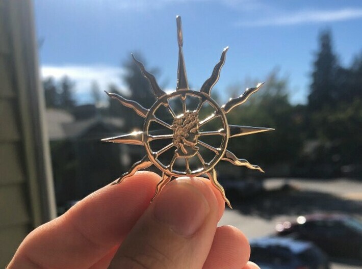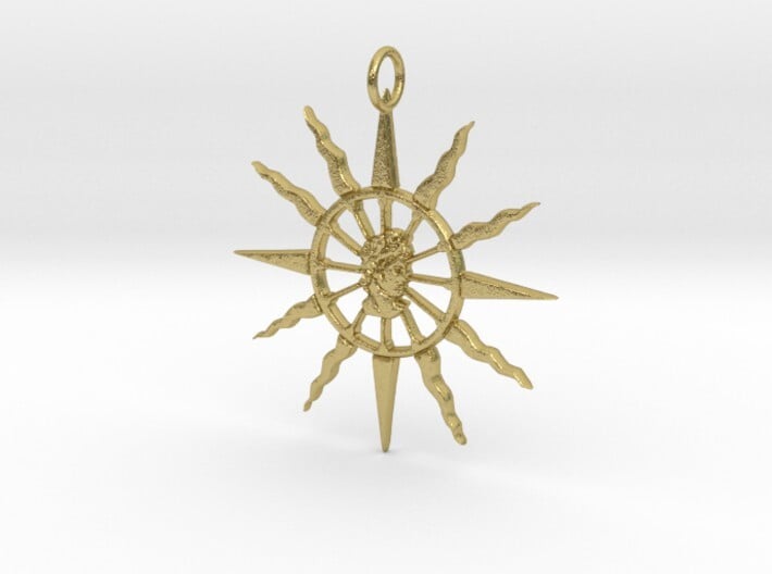 The pendant is made of a twelve spokes chariot wheel inside a twelve spikes sun. Apollo's has the symbol of the chariot of the sun, and the chariot is the early technological means of Indo-European dominance. 12 spokes & spikes because it is a sacred number in indo-european religions, for instance it's the number of Olympian gods. Eight of them are wavy rays to make it clear it is our sun because other stars are commonly symbolized with straight rays. And four of them are straight rays in the common "four directions", in order to symbolize a propencity to expand in every direction and dominate all aspects of life. The central piece is the bust of the iconic Leochares' Pythian Apollo, better known as Apollo Belvedere from 320 B.C.