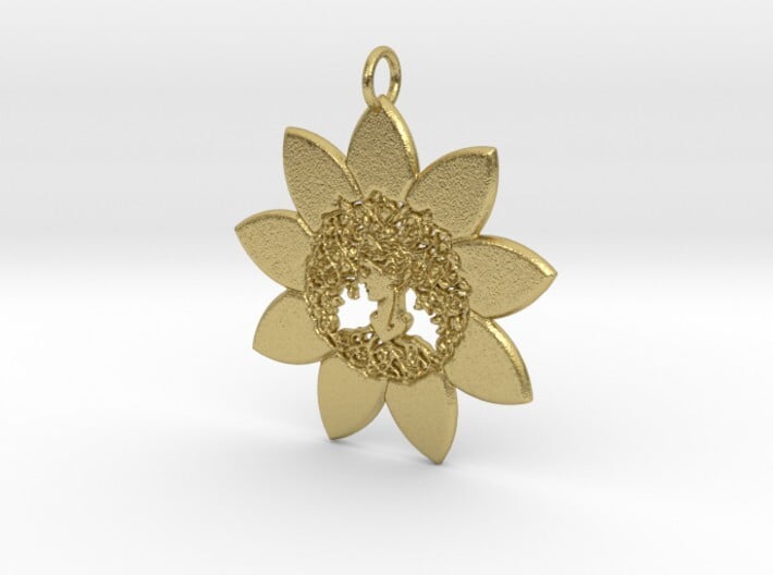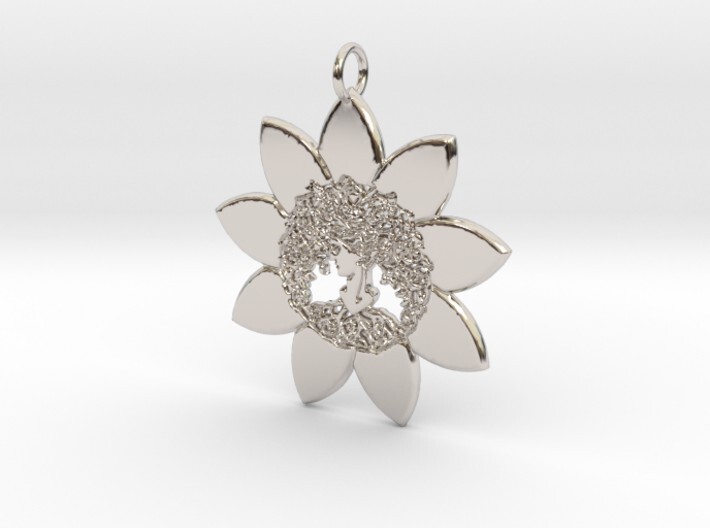 The design is made of a nine petals sunflower. 9 being a sacred number as it is the cycle of gestation and the number of muses. If she is going to be associated with the earth and plants, then surely the sunflower ought to be her flower, as a flower which turns toward the solar principle, and which has a radiant shape, "as above so bellow". It is also a flower which produces many grains, which makes it a symbol of fertility. Diana has a role as protector of the young pregnant women and childbirth (epithet Lucina "light" of the moon, as its cycles were used to track female fertility). The world oak tree which sits inside with its deep roots and overflowing branches, represents the continuation of lineage and the transmission of culture which are feminine roles. The central piece is Diana's bust, as goddess of feminine beauty, youth, breading and verdant nature (epithet Rustica).