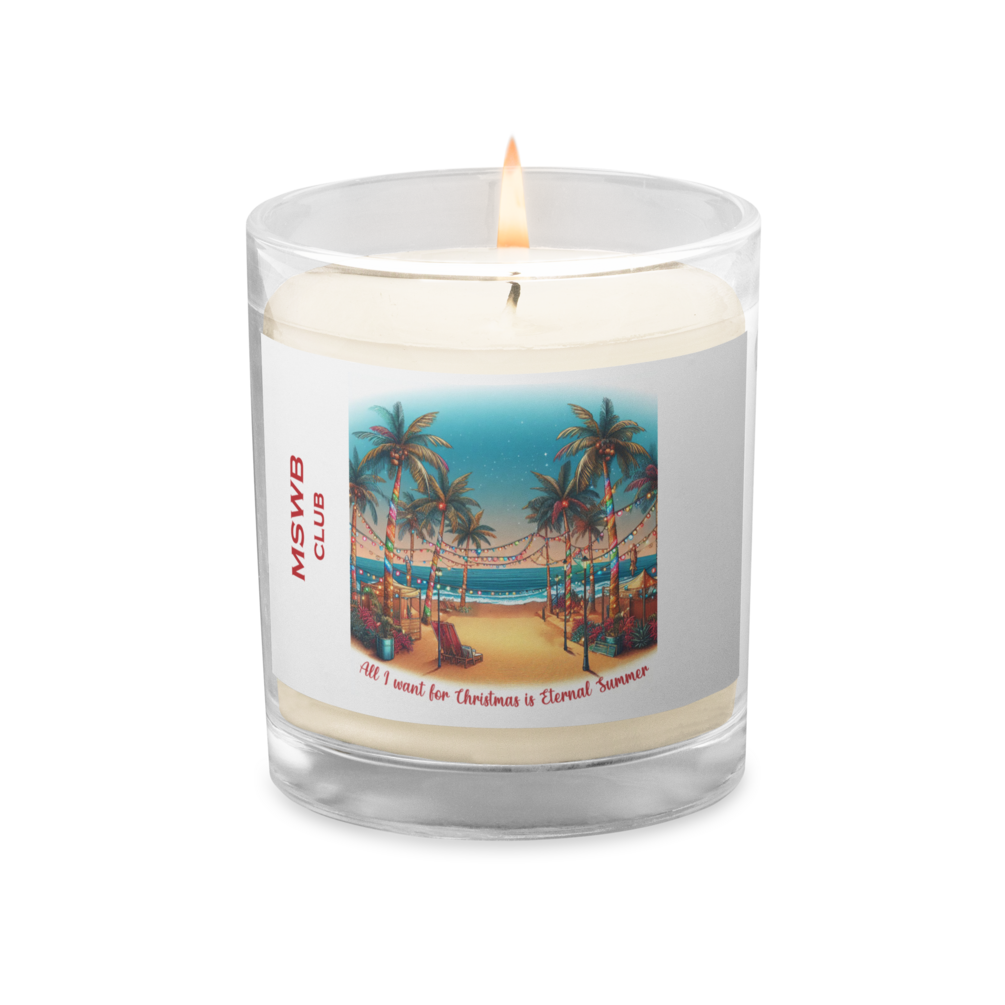 Vertical MSWB logo on the side, "All I want for Christmas is Eternal Summer" and a christmas beach in the center
